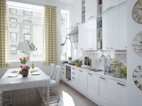O astfel de abordare permite o depozitare variata, incluzand o mini-biblioteca, mai multe electrocasnice incorporate in mobilier sau chiar un spatiu de birou. Pentru a pastra totul cat mai luminos si aerisit, s-a optat pentru fronturi albe, cu un design modern, minimal. Stilistic, bucataria mizeaza pe o abordare scandinava, bazata pe functionalitate si cu o estetica redusa la esential. Locul de luat masa din mijlocul bucatariei merge inspre o zona de orientare clasica, fara a intra in dezacord cu stilul mai auster al nordicilor.