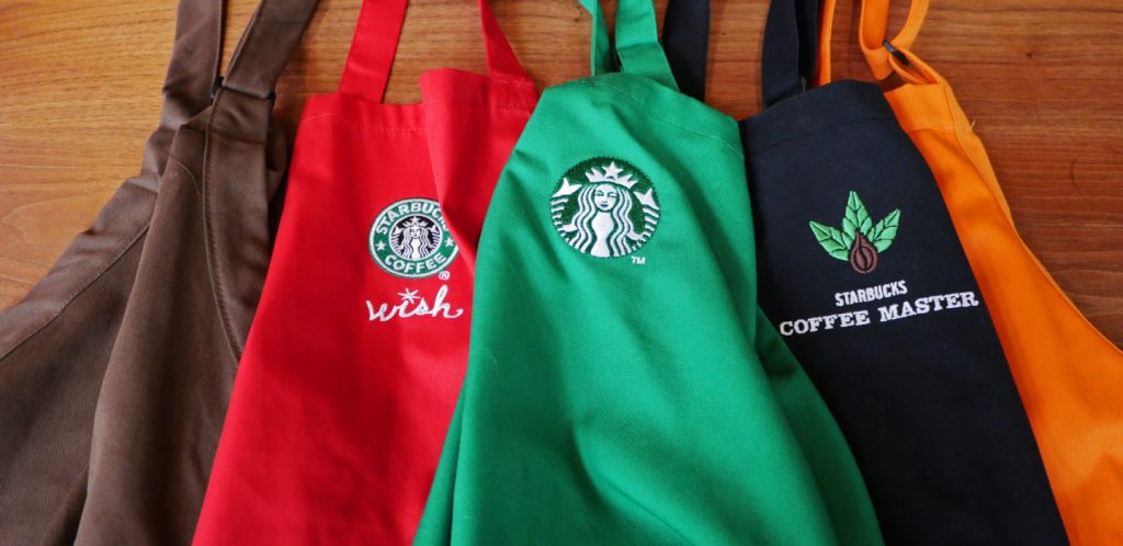 Potrivit unei postari pe site-ul official Starbucks, orice angajat poate purta șorț starbucks verde, dar angajații care au servit în armată, de asemenea, au opțiunea de a obține șorțurile lor brodate cu un steag american. În plus, acei bariști care au absolvit Cursurile de realizare Starbucks College, primesc un șorț brodat cu un mortarboard. Dacă sunteți un barista surd, compania va broda cuvântul „Starbucks” în limbajul semnelor.