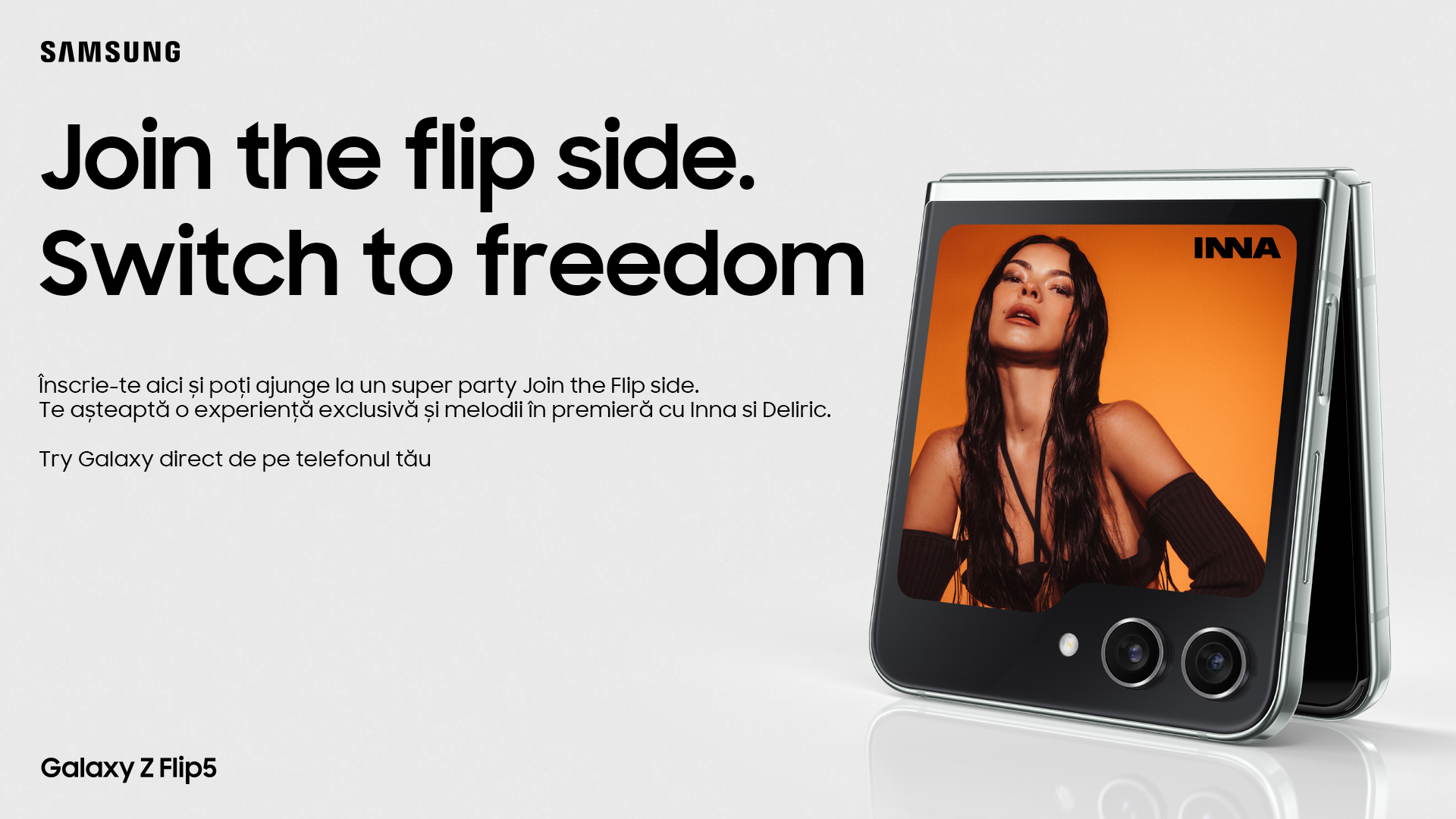 ,,Join The Flip Side. Switch to Freedom” îi va ajuta pe utilizatori să se familiarizeze cu procesul de trecere de la un telefon cu ecran static la unul cu ecran pliabil, dar și cu tranziția de la un sistem de operare închis la unul care oferă consumatorilor libertatea de a-și personaliza complet dispozitivul în funcție de propriile nevoi și preferințe. Pe parcursul a două luni, INNA și Deliric, alături de alți ambasadori Samsung, vor aduce în prim-plan experiențele personale cu Galaxy Z Flip5 și respectiv Galaxy Z Fold5.